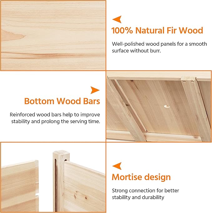 • Natural Fir Wood: This raised garden bed is made of non-paint fir wood. Thanks to its strength, stability as well as natural resistance, this natural planting bed will work well for a long time