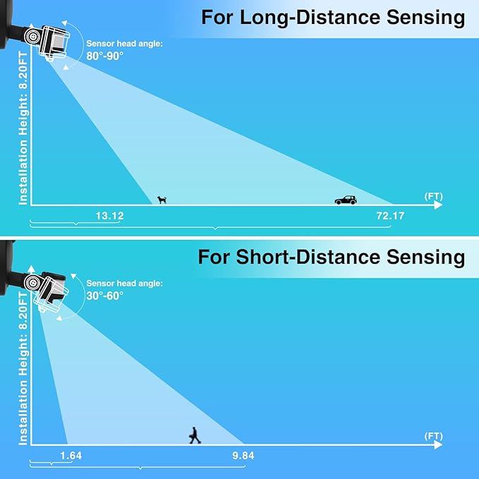 • Adjustable Sensing Mode: You can use the 3 knobs at the back of the sensor to adjust the detection distance, lighting duration and ambient brightness to activate the sensor. Setting the security light to work only at night or both day and night. 180° ultra-wide sensing range, 32.8ft sensing distance and 7~420S continuous illumination time provide you with a larger viewing area for an excellent nighttime experience. Tips: Not Solar Powered