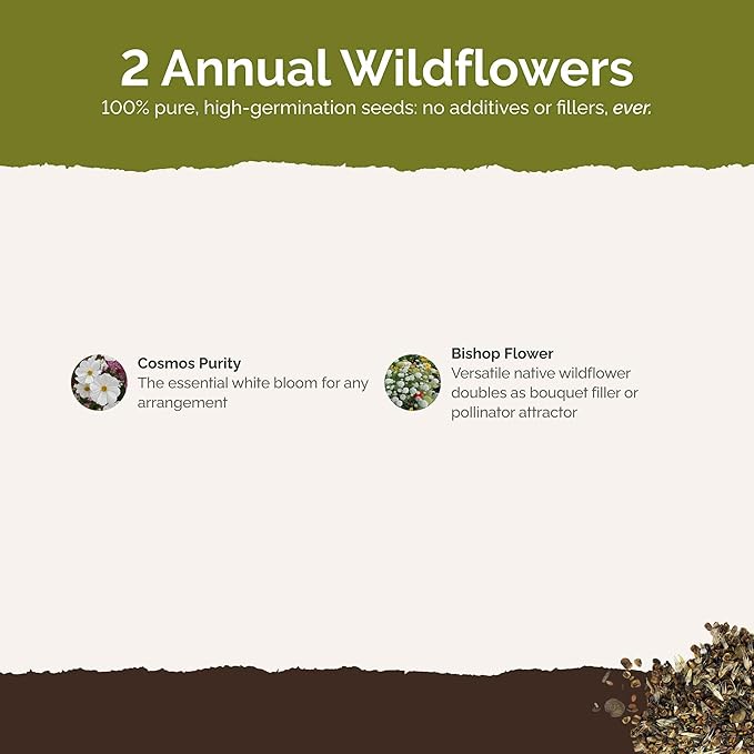 • 100% Pure, Non-GMO Seeds - No fillers, favorites only! Includes 2 easy-to-grow species: Cosmos Purity, Bishop's Flower