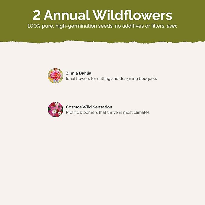 • 100% Pure, Non-GMO Seeds - No fillers, favorites only! Includes 2 easy-to-grow species: Zinnia Dahlia Flowered, Cosmos Sensation