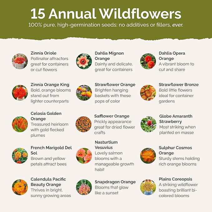 • 100% Pure, Non-GMO Seeds - No fillers, favorites only! Includes 15 easy-to-grow species: Zinnia Oriole, Dahlia Mignon Orange, Dahlia Opera Orange, Zinnia Pompon Orange, Double Strawflower Orange, Double Strawflower Bronze, Celosia Golden Orange, Safflower Orange, Globe Amaranth Strawberry, French Marigold Del Sol, Nasturtium Vesuvius