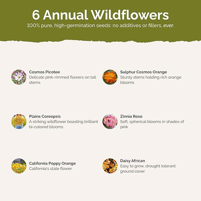 • 100% Pure, Non-GMO Seeds - No fillers, favorites only! Includes 5 easy-to-grow species: Cosmos Picotee, Cosmos Bright Lights, Plains Coreopsis, Zinnia Rose and more