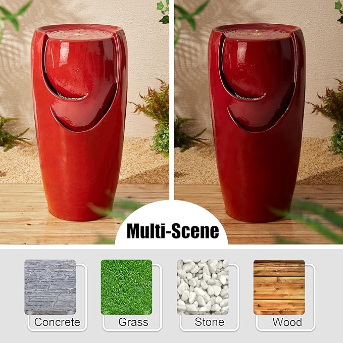 • Relaxing Water Sound: Rustic ceramic water fountain offers vintage yet modern accent. Features trickling water rippled and sparkled in the warm white LED light, elegant and charming kiln-fired red glaze finish. With a stylish antique look, the fountain brings a touch of natural beauty, the soft sound of cascading water is sure to make you relax and makes a soothing rest for you in the garden. The pump can be adjusted to prevent loud water sound