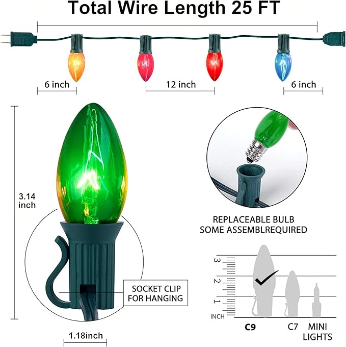 • C9 Christmas Lights Outdoor:c9 multicolor christmas lights outdoor are designed with a C9/E17 candelabra base, making them compatible with a wide range of lighting fixtures. With 175 watts per set, you can connect multiple sets end-to-end to cover a larger area, effortlessly customizing your decorative lighting needs. The 120V power supply ensures stable and consistent illumination, making your Christmas display truly captivating.