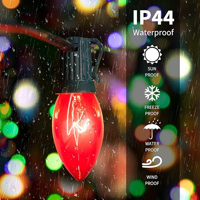 • C9 Clear Christmas Lights Outdoor: C9 Multicolor Christmas Lights are UL Listed for both outdoor and indoor use, giving you peace of mind when decorating your garden, patio, yard, cafe, tent, porch, deck, party, or backyard. The UL certification ensures that c9 bulbs christmas lights meet strict safety standards, so you can enjoy your holiday season without any worries.