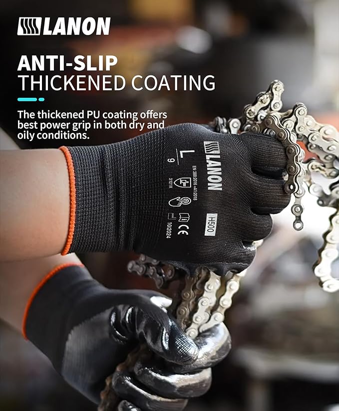 LANON 12 Pairs Safety Work Gloves, Mechanic Working Gloves for Men, PU Coated, Seamless Knit, Lightweight, Black, XL