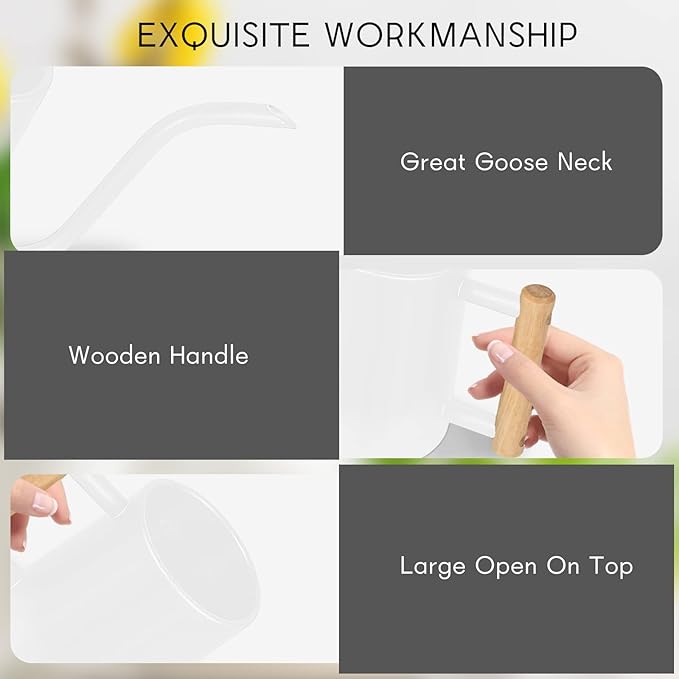 • [COMFORTABLE WOODEN HANDLE] The indoor watering can has a round comfortable wooden handle that is easy to grasp and won't cut your hands.This stainless steel watering can open built-in open top design, it is convenient to refill water