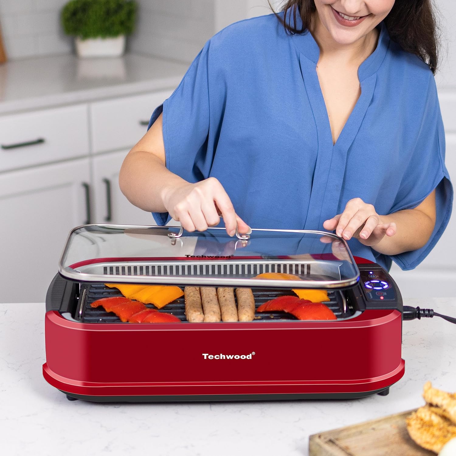 Smokeless Indoor Grill, Techwood 1500W Electric Grill Portable Korean Grill Non-Stick Grill Plates with Temperature Control, Removable Drip Tray, Tempered Glass Lid, Dishwasher-Safe