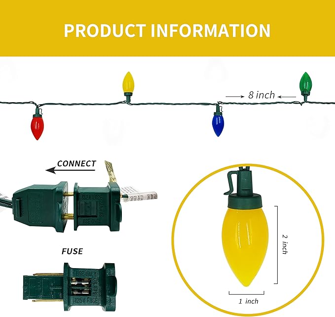 • [Intimate design] Suitable for occasions of various sizes, the total length of a string of lights is 34.5 feet, light length 32.5 feet, the length of the front plug is 20 inches, and the tail plug length is 8 inches. the distance between the bulbs is 8 inches, the height of the bulb is 2 inches, the width is 1 inches.