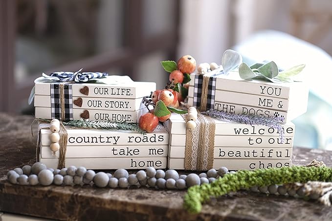 • 🎶【BEAUTIFUL FARMHOUSE DECOR!】-These handmade book stack are designed for tiered trays, shelf decor, mantels, tablescapes, and entryway decor! These book stacks fit in perfectly with your Rae Dunn Decor. Each book is hand distressed at each edge to give it a farmhouse/ rustic appearance.