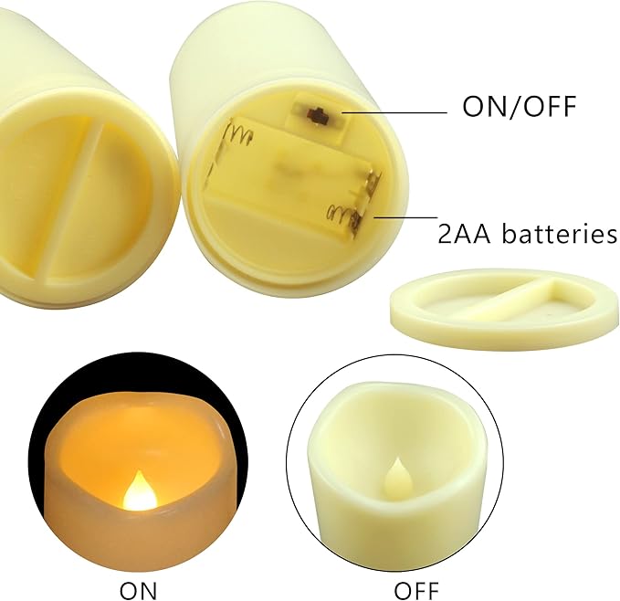 • Look and flicker like real candles, and safe to use with. With flickering LED bulb and realistic appearance, the plastic resin battery candles look like and flicker like real candles. Battery operated LED flameless candles are safe to use with, especially when you have children, seniors and pets at home. There is no fire hazard, no fume and no wax mess.