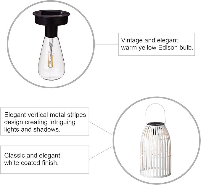 • 【Solar Powered Lantern】 Traditional farmhouse hanging lantern design, novelty birdcage shape main body and warm yellow Edison bulb. This Solar Lantern can be hung on anywhere you want, perfect for garden, yard, patio, porch, wall, pathway, driveway, lawn, camping, trees, pergolas, etc. outdoor solar landscape lighting and decoration.
