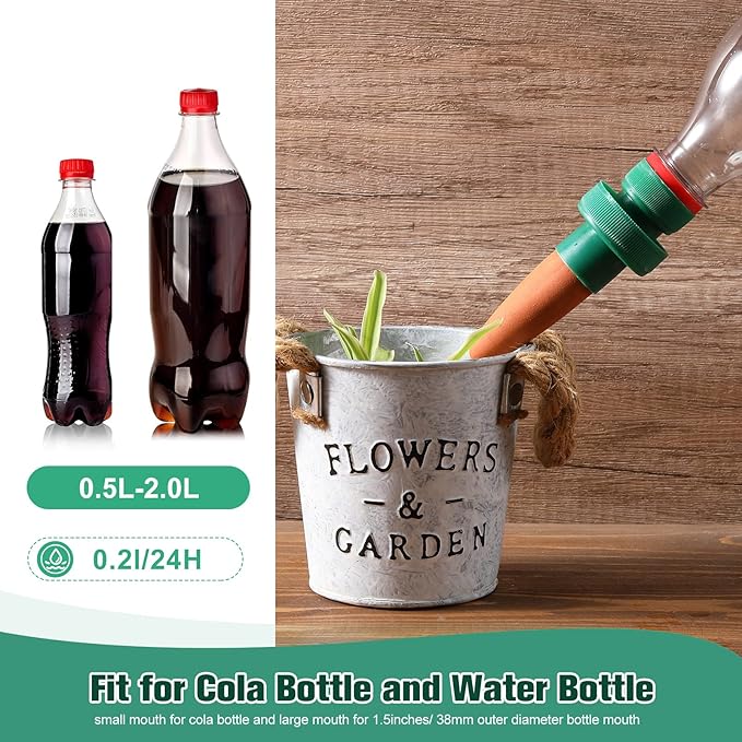• Easy to Use: these watering spikes fit for 2 different size plastic water bottles, depending on the size of the bottle applied you can water your plants more than 1 week. Choose the water bottle and remove the neck ring of it if water leaked out of the bottles where the stake was attached