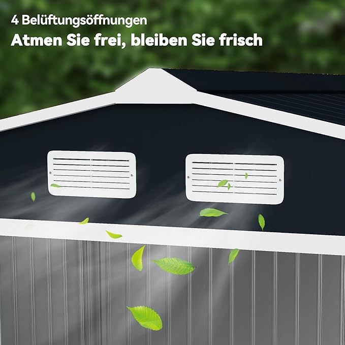 • Good Ventilation: Our metal outdoor storage sheds feature four ventilation slots on the front and back, increasing light and airflow. This prevents odor and keeps your equipment and tools dry.