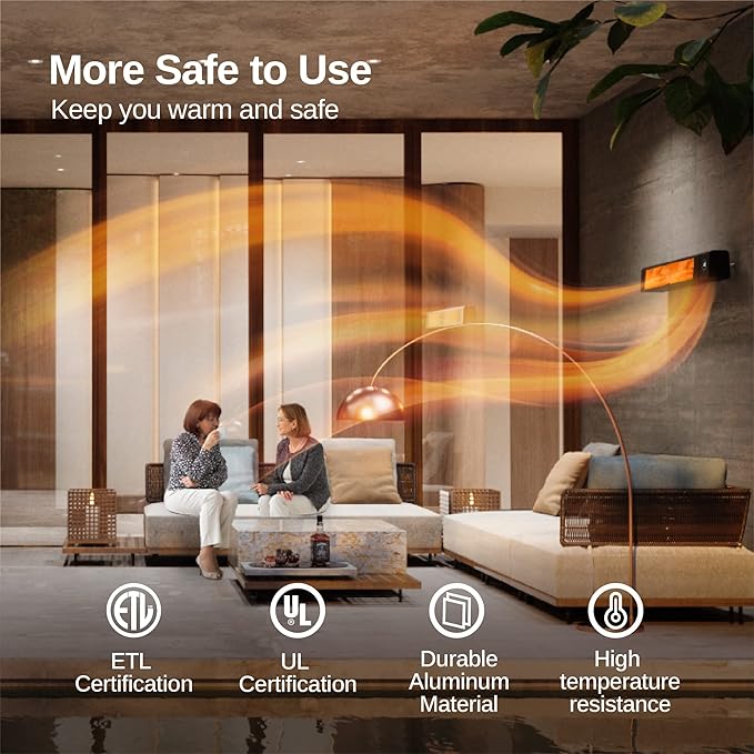 • HIGH-LEVEL IP65 WATERPROOF&DUSTPROOF: This patio heater is equipped with new connection structure that is completely waterproof and dustproof. With IP65 protection rating and ETL & UL certification, it can withstand any element, making it perfect for home, backyard, garages, outdoor patios, etc. Create a comfortable environment for both indoor activities and outdoor recreation