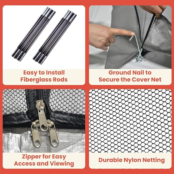 • Garden pond net easy set up - Follow Dome Cover Net installation instructions, the garden dome cover is easy to set up. Attach the connected fiberglass rods through the diagonal of the pond cover for fish and finally insert 4 corner pegs into the fiberglass rods and secure with ground stakes. Press the pond pool dome net bottom edge with dirt or sand, let the perimeter bottom of garden dome net can be tightly fitted to the ground, especially when it's windy.