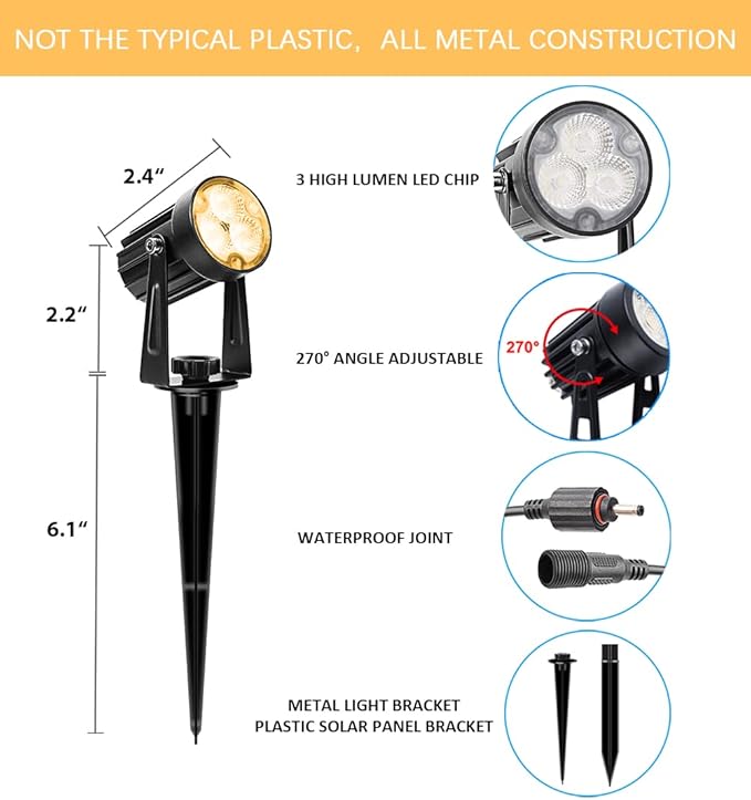• 【2 installation methods】Easy to install:The solar panel and outdoor solar landscape lights can be installed in the ground or mounted on the wall with included screws. Each solar garden spot lights with 118inch/3m cable, 270° Adjustable freely up or down to meet different requirements