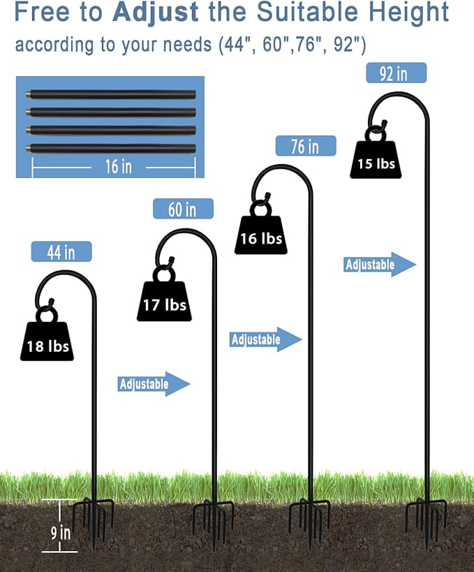 • Extendable & Tall Hook Hanger: The outside shepherd’s hook hanger made of 3/5 inch width & 2mm thickened steel pipe with 7 solid anchor points, you can free to adjust the suitable height for 92", 76", 60 " or 44 ", and also make it stands firmly in the ground without easily falling down, no fear of severe weather such as strong winds, heavy rains, and blizzards, (1 PACK / SET)