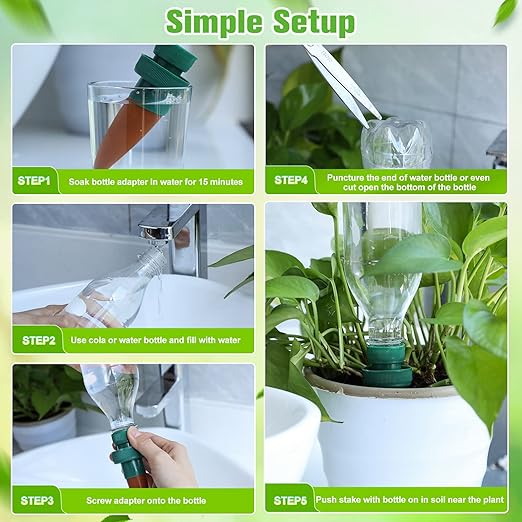 • Effortless to Install: foremost, soak this bottle adapter in water for about 15 minutes, and then use standard water bottle and fill it with water, screw this bottle adapter onto the bottle, poke a small hole to let a bit of air in as it drains, finally, push this stake with bottle into soil near the plant