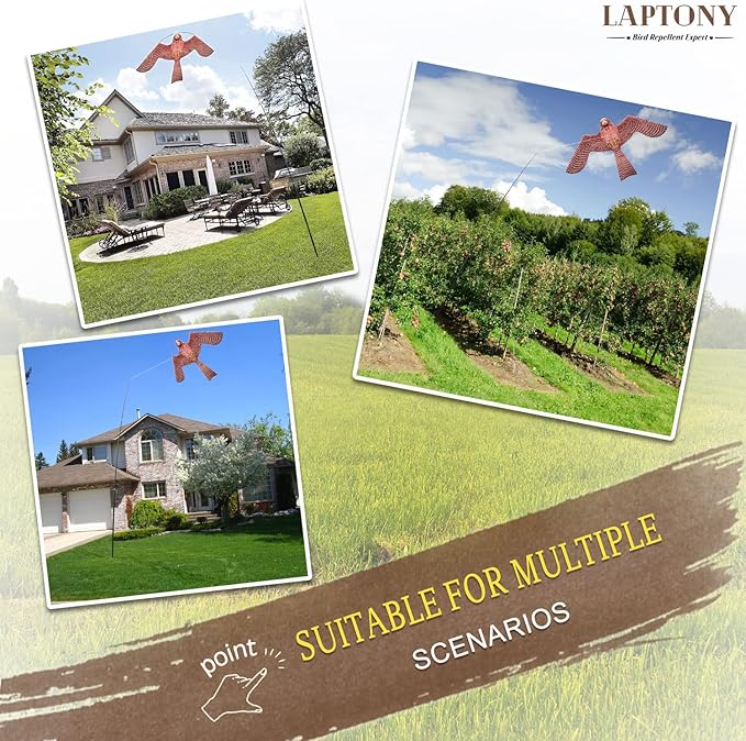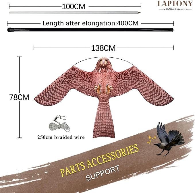 • HOW BIRDS SCARER WORKS: The vibration generated by the bird scarer kite's wings in the wind, as well as the dynamic behavior of flying with the wind, the realistic patterns and colors, have the effect of scaring the birds, without causing them harm. It can protect farmland, Gardens, orchards