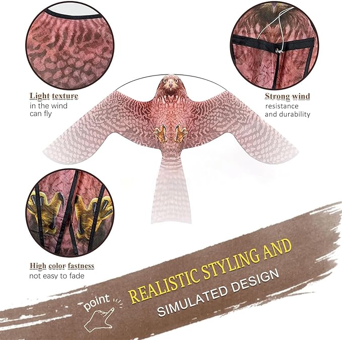 • HOW BIRDS SCARER WORKS: The vibration generated by the bird scarer kite's wings in the wind, as well as the dynamic behavior of flying with the wind, the realistic patterns and colors, have the effect of scaring the birds, without causing them harm. It can protect farmland, Gardens, orchards