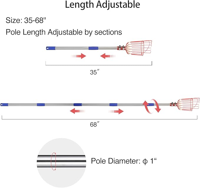 • ▼【Length Adjustable】Cherry picker tool length is adjustable by sections to be 35" to 68" which is safer and more efficient to get fruit from tall trees without falling off a ladder any more.