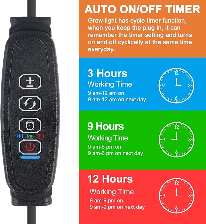 • 🌱【Timer Function & Multiple Settings】The indoor seedling light offer the circular memory timer function with 3 options-3h/9h/12h. When keeping power, it can automatically turn on and off every day according to your settings.【 You Could Operate One of Them Separately and Support 5 Levels of Dimming.】