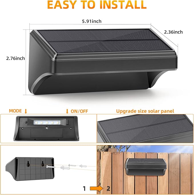 • 【PAY ATTENTION】Solar products need to be installed in places without obstructions. If they are installed indoors, under the eaves, in the shade of trees, or in the backlight, it will cause the illusion that the lights are broken. The solar panel needs direct sunlight to charge, if your solar fence lights show different brightness from other lights after using for a period of time, please check for the above problems. When there is a product quality problem, please contact us in time.