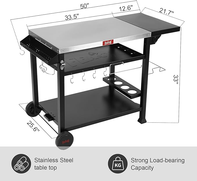 • Sturdy Structure: This grill table for outside has 2 big size wheels and 2 horseshoe. And the tabletop and bottom plate can hold 150 lbs and 100 lbs respectively, add the middle plate can bear up to 350lbs in total. The strong frame meets all your outdoor cooking needs