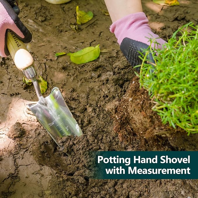 • Versatility. This gardening tool set can help you with a variety of gardening. The hand shovel helps you transplant, shovel soil, compost, and more. You can use the hand fork to aerate and loosen the soil. The transplanter has a long, thin head for easy transplanting. Clear depth markings allow you to measure soil depth in inches or centimeters to ensure that seeds, bulbs, and small plants are set at the correct depth. Gardening is easy with the Berry&Bird Classic Gardening Tool Set!