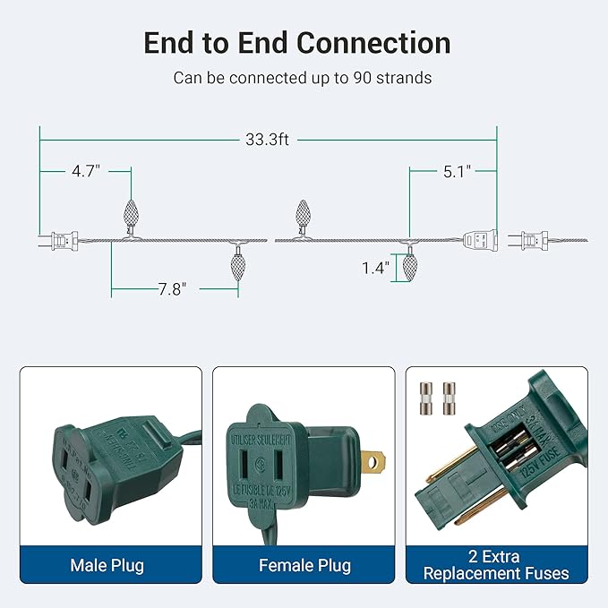 • 【Considerate Design】 Bright C7 LED bulbs, diamond-shape caps, 33.3ft lighted length, 7.8’’ bulb spacing, 4.7’’ lead length; The green sturdy three corded wires completely tangle free and blends easily. Comes with 2 spare fuses.