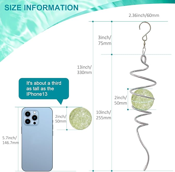 • 【 High Quality Spiral Tail Decor 】This stainless steel wind spinner spiral tail is made of 304 stainless steel wire, the colored ball is made of pure K9 crystal glass material. After exposure to sunlight during the day, the glow orb glows in the dark, it is not intended to replace standard lighting. Exceptionally resistant to inclement weather, the ball of the spiral tail will not fade even in direct sunlight. This decorative spiral wind-spinner to match any decor.