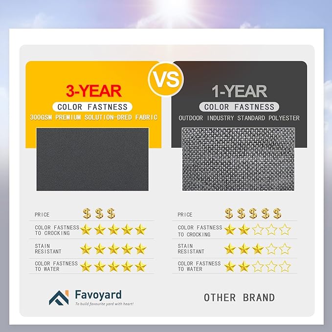 • 3-year Color Fastness - Our patio chair cushions adopt 300GSM High Density polyester fabric, thanks to the superb coloring technology, we proudly say the fading resistant is 20 times that of ordinary products, Favoyard outdoor seat cushion for patio furniture is a perfect decor in garden, patio, beach and etc.