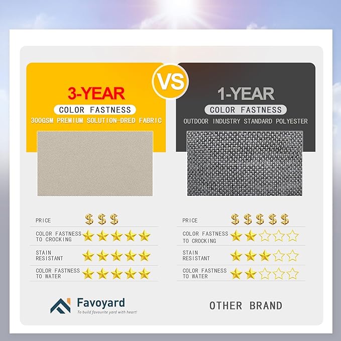 • 3-Year Color Fastness - Our patio chair cushions adopt 300GSM High Density polyester fabric, featuring a smooth yet slightly textured surface with a firm hand feel. Thanks to the superb coloring technology, we proudly say the fading resistant is 20 times that of ordinary products. Favoyard outdoor seat cushion for patio furniture is a perfect decor in garden, patio, beach and etc.