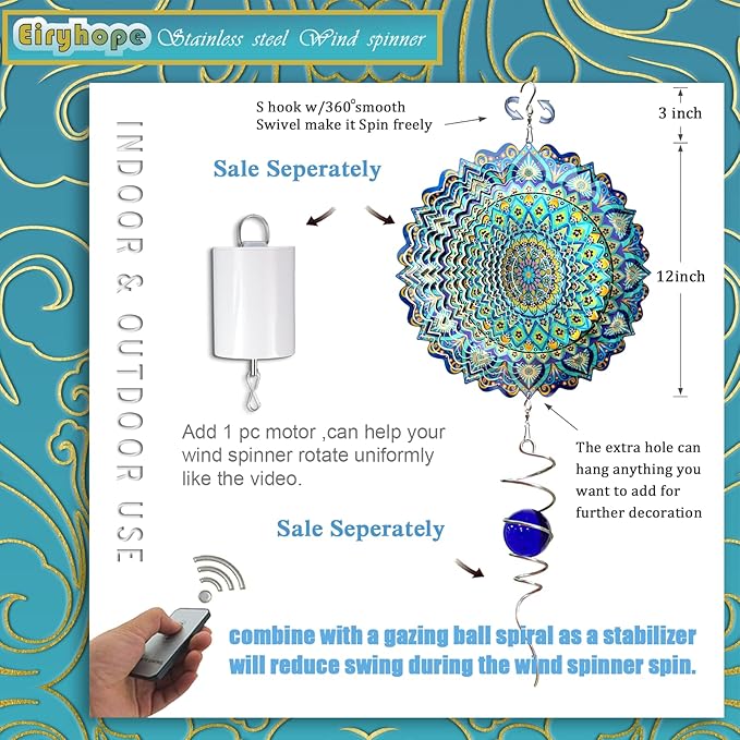• 【 Premium Kinetic Wind Spinner Decor 】Our high quality wind spinner is a durable and artistic hanging decor. Made of stainless steel material, laser cut, hand polished and painted with epoxy protection, this stainless steel wind spinner is one of the best metal wind spinners, highly weather resistant, rust resistant and reflective. This quality outdoor décor has incredible color and light reflections that add color, movement and beauty to indoor and outdoor spaces.