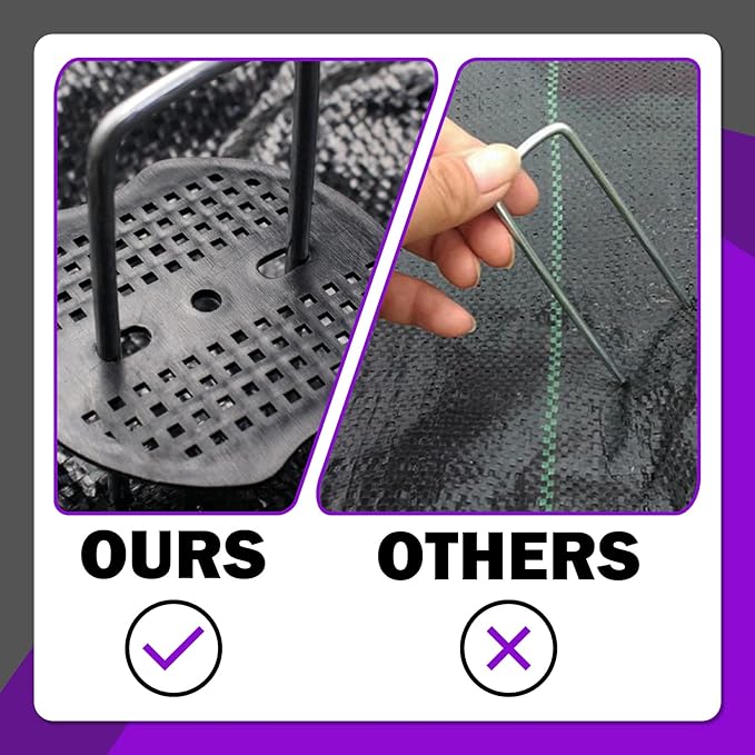 • 🏡 Strong Stakes Staples with Good Gasket -------- These are good stakes staples for your garden fabric to hold it in place. The Stakes staples fit well between the gasket and hold down unlike ones without the gasket that can slide up over time. Also comes with a nice hook to pull it back if you want to move or readjust it. Overall, pretty decent set and works well.