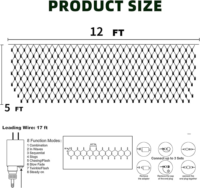 • Christmas Net Lights: Christmas 360 LED net lights, the size is 12 FT X 5 FT, the lead length is 16.5 FT, and the horizontal distance between each lamp bead is 4.7 inch. Place or hang the exquisite net lights on the trees, grass, bushes or any place you want, very easy to decorate.