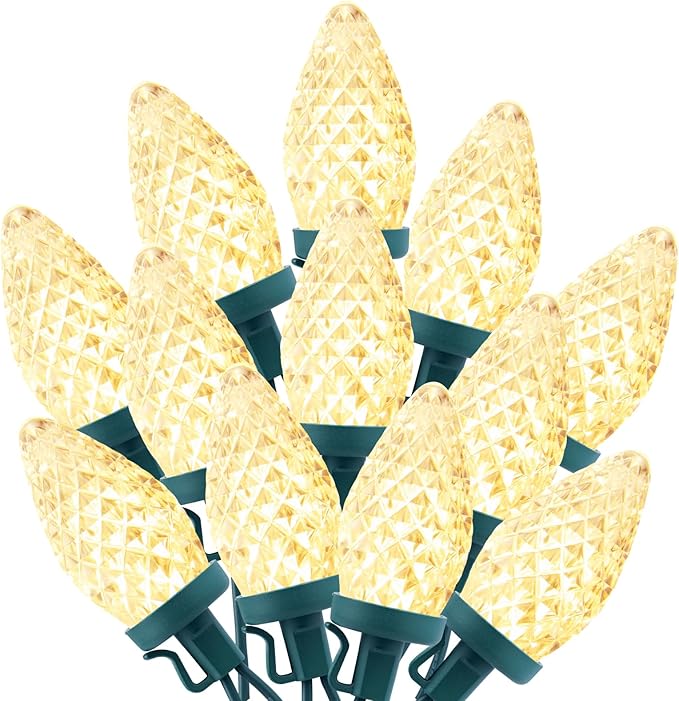 • 【 Brilliantly Bright Glow 】- These lights feature large, faceted C9 bulbs made from durable polycarbonate, offering good brightness, color saturation, ruggedness and reliability. Built-in SMD LED creates vivid lighting effects; the diamond facet hole design prevents stagnant water. Bulbs with vibrant colors will never fade, chip or crack
