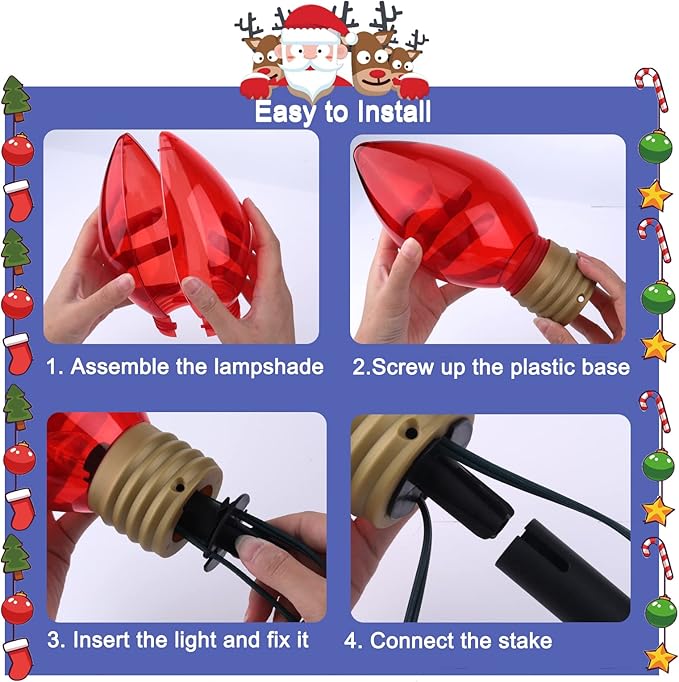 • Product Including: 8.5 feet long green wire string lights with 5 lights bulbs, 5 multicolored jumbos C9 bulbs, and this Christmas light sets come with 1 spare fuse and 2 spare bulbs for easy replacement. Amazing landscape stake lights, perfect for residential, commercial, and holiday decorations