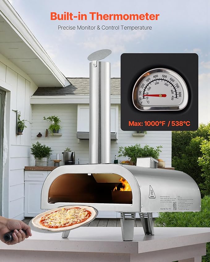 VEVOR Pizza Oven Outdoor, 12" Pellet Pizza Oven, Portable Pizza-Stove with Built-in Thermometer, Wood Fired Stainless Steel Pizza-Maker, for Backyard, Camping, Pizza-Stone, Shovel, Carry Bag, Silver