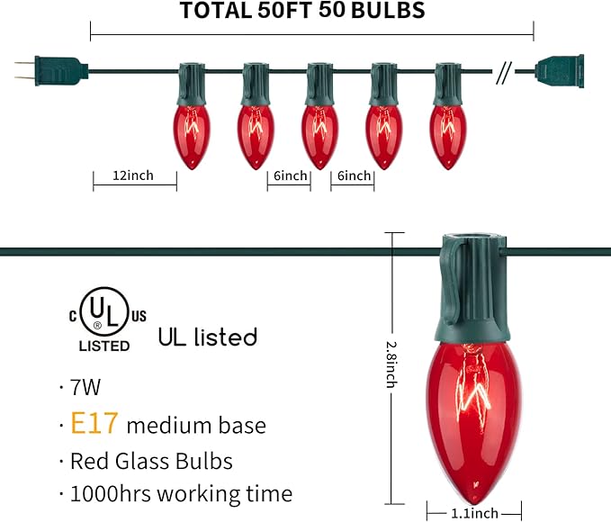 • Christmas string light, 52pc(2 spare) C9 clear red bulbs, 6" lead with male plug, 12" spacing between bulbs, 6" tail with female connector. Lighted Length 49 Feet, total Length 50 Feet