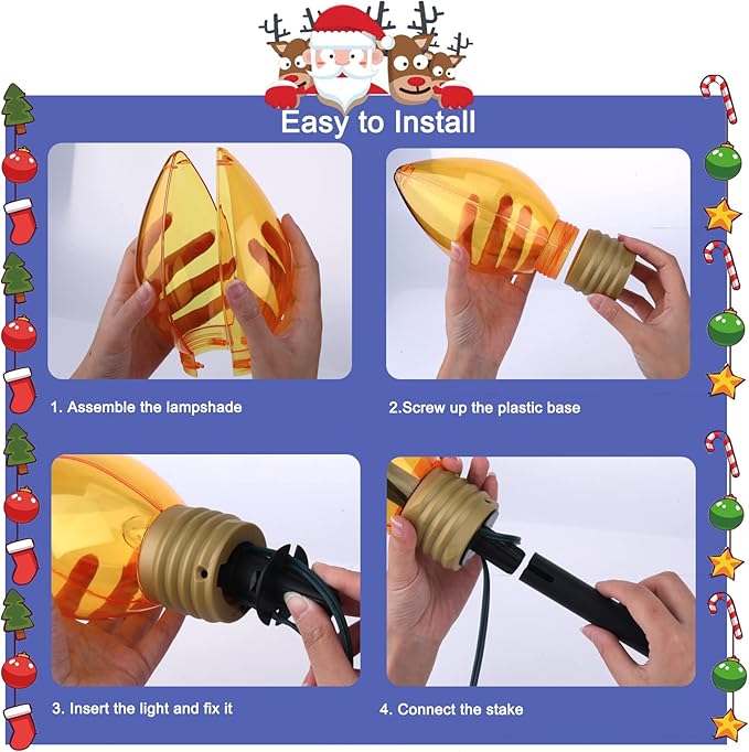 • Replaceable: Turn the yard Christmas lights support on the base and pull out the internal C7 light bulb from the outer jumbo c9 bulb, screw out the damaged bulb from the bulb holder, then screw in a new one gently. And turning off one light will not cause the other lights to go out, which is very user-friendly. These light strings are extremely durable and have an average life of 5,000 hours