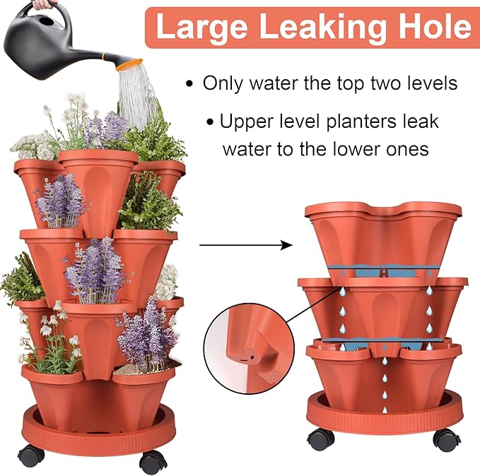 DUNCHATY Stackable Planters 4 Tier Vertical Garden Planting Tower Planters Strawberry, Herb, Flower, and Vegetable Planter Indoor Outdoor Gardening Pots with Removable Wheels and Tools, 2 Bundle