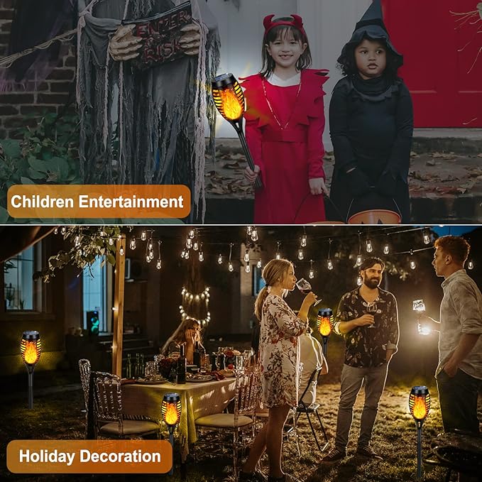 • 🎃【OCCASIONS WIDELY USED】The beating flame of the garden lights solar powered waterproof illuminates your house, garden, patio, yard, passage, driveway, etc. in the dark, so that the whole home is still bright and warm in the dark night; solar flame torch lights outdoor can be added to parties, camping, barbecues, weddings, etc. Bonfire atmosphere; can be used as a festive landscape decoration to provide the perfect romantic holiday atmosphere for your Halloween, Christmas, Valentine's Day, etc.