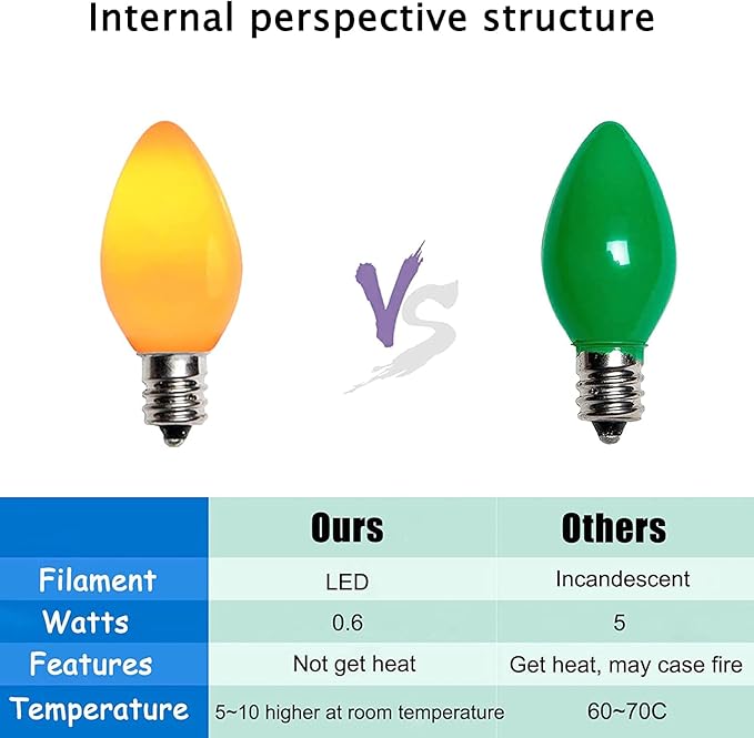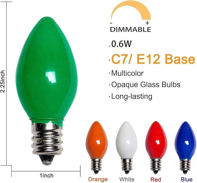 • Energy Saving LED Bulbs- C7 multicolor christmas led lights with E12/C7 candelabra socket base. Each bulbs 0.6 watt,120 Volt, 2700K warm white. Energy-saving c7 christmas lights replacement bulbs do not generate heat, and the temperature is lower than that of traditional incandescent bulb. low wattage will save more energy for you.