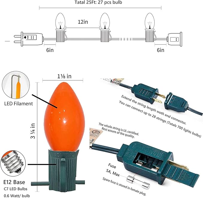 • C7 LED Christmas Lights- 25Ft Christmas LED string lights with 25 Opaque Multi color C7 LED light bulbs- Red, Blue, Green, White and Orange bulbs, total length 25 feet. Commercial grade indoor outdoor Christmas decorative lights.
