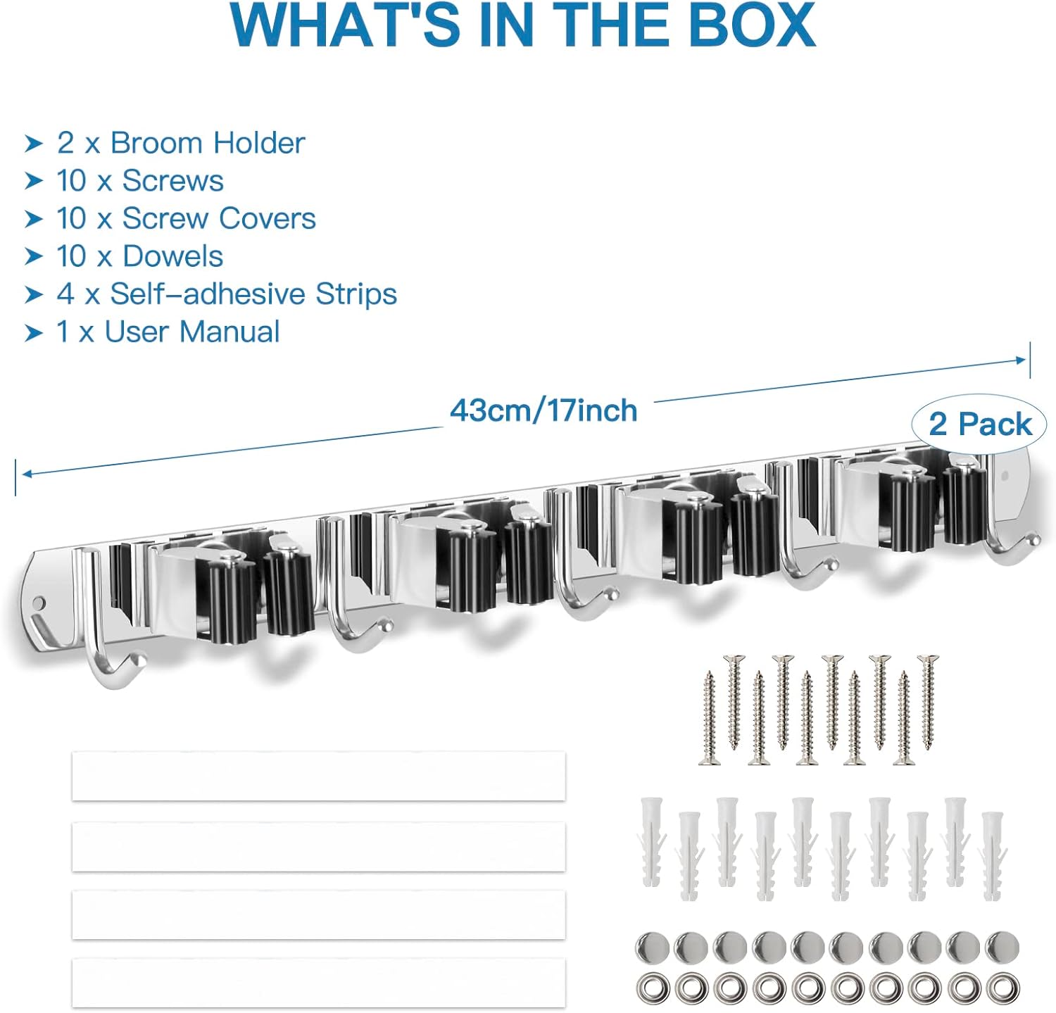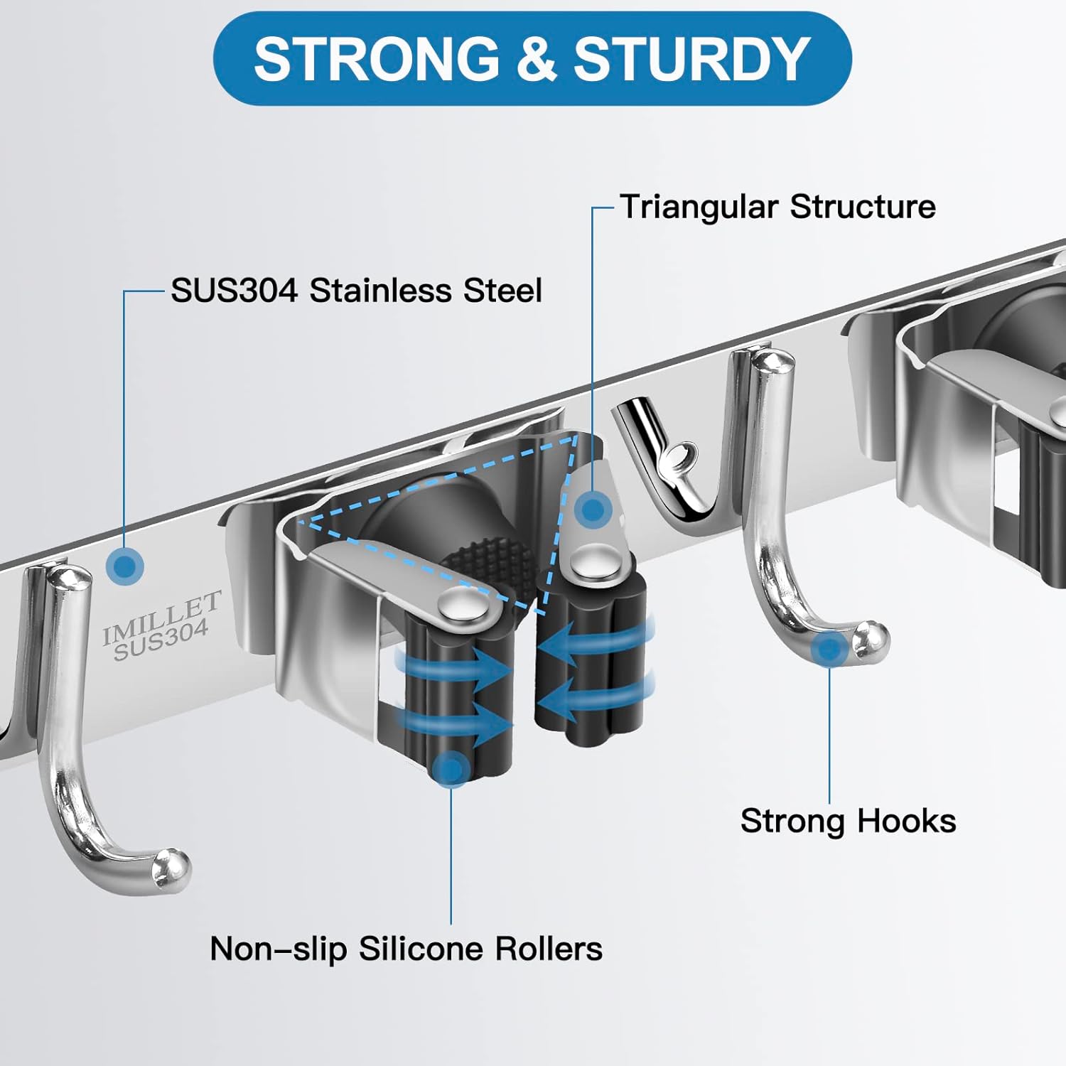 • STRONG & STURDY: Broom organizer wall mount is made of 304 stainless steel, corrosion-resistant, moisture proof and waterproof. Compared with the plastic broom rack, it's more stronger and sturdy. And this broom hanger wall mount can hold up to 200 pounds