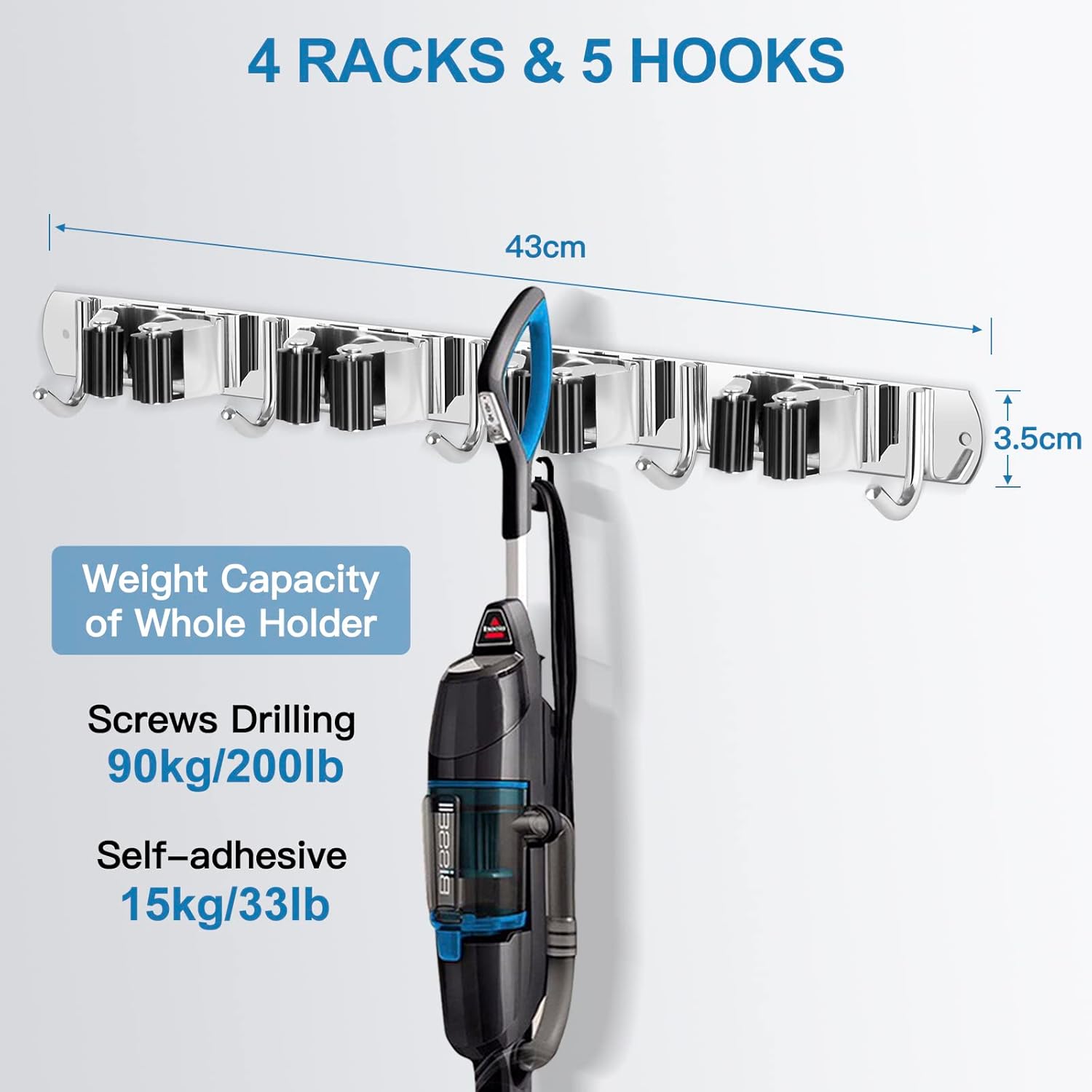 IMILLET 2 Broom Holder Wall Mounted, Stainless Steel Broom Mop Holder Self Adhesive Heavy Duty Hooks Storage Organizer for Home Laundry Room Garden Garage Closet Kitchen(4 Racks with 5 Hooks)