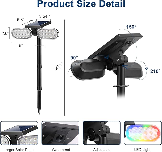 • << Double Heads 210° Adjustable >> Double heads design of our solar landscape spotlights, the lighting area is larger, 210°adjustable no wires to run multicolored solar spotlight, Zero electricity bill.