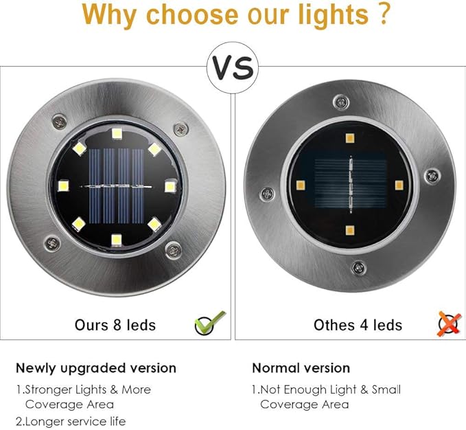 • High Efficiency Light: Our upgraded solar lights with built in 600 mAh NiMH large capacity rechargeable battery, can light up for 8 hours after fully charged, maintain a continuous and well illumination even though on occasional rainy days and cloudy days